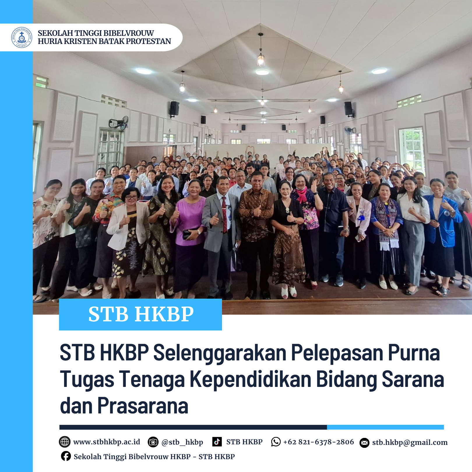 Pelepasan purna tugas Tenaga Kependidikan bidang Sarana dan Prasarana atas nama Hokkop Samosir berlangsung di Aula STB HKBP pada 26 November 2025 dan berakhir setelah seluruh kegiatan penutup selesai dilaksanakan.